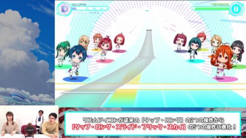 app.famitsu.com 操作の名称が登場。タップ = 青、ロング = 緑、フリック = オレンジ、スカイ = 赤(スライドは、ロングとスカイに付随するもの)口頭での説明のみでしたが、光るオブジェクトはスキル発動☆は画面効果が発生するものだそうです。(MVモードだか…